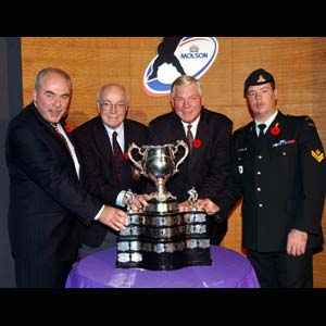 (Retired) Garth Webb, Hockey Hall of Fame Chairman Bill Hay, and Master Bombardier Rodney Gallant pose with the Memorial Cup.