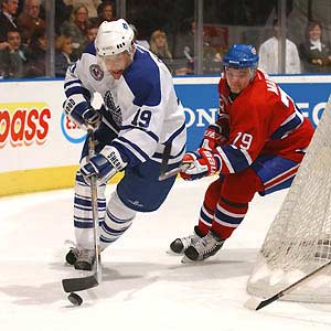 Mikael Renberg dangles with the puck as Andrei Markov gives close chase during the 2002 HHOF game. (Saturday, November 2, 2002 - Dave Sandford)