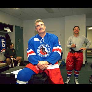 Clarke Gillies (centre), Rod Langway (left) and Bernie Federko (right) share a few quiet moments before being introduced and taking part in the 3rd annual Hockey Hall of Fame Legends Game. (Sunday, November 3, 2002 - Matthew Manor)