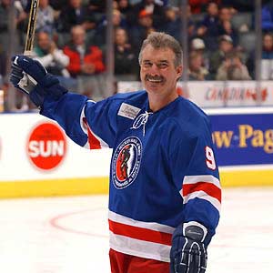 Clark Gillies salutes the admiring crowd during the 3rd annual HHOF Legends Game. (Sunday, November 3, 2002 - Dave Sandford)