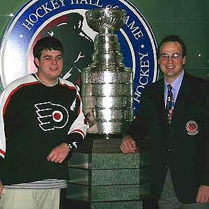 Philadelphia alumnus Honoured Member Dale Hawerchuk flanks the Stanley Cup with another Flyer fan. (Kodak Photo Day, November 1, 2003 - Mike Gouglas)