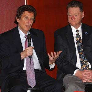 Honoured Member Mike Ilitch (left) responds to a fan's question at the RBC Inductee Fan Forum held at the Hockey Hall of Fame. Fellow Honoured Member Brian Kilrea is seated to his left. (November 2, 2003 - Dave Sandford)