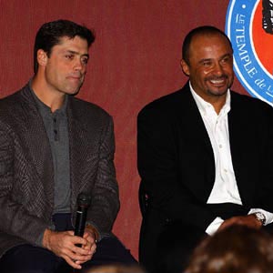 Soon-to-be-inductees Pat LaFontaine (left) and Grant Fuhr (right) act smug when asked on who owned each other's number on breakaways. (RBC Inductee Fan Forum, November 2, 2003 - Dave Sandford)