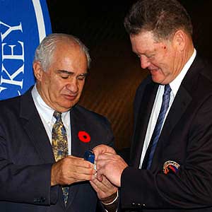 Brian Kilrea (right) slips on his Hockey Hall of Fame ring as co-presenter Jim Gregory watches by. (November 3, 2003 - Dave Sandford)