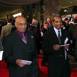Willie O'Ree (left), the first black player to have ever played in the NHL, is accompanied by Ken Martin, Director of Community and Diversity Programming at the NHL, as they come down the red carpet en route to Induction 2003. (November 3, 2003)