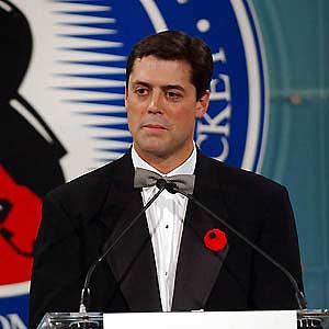 Playmaking extraordinaire Pat LaFontaine addresses the crowd during his Induction speech. (November 3, 2003)