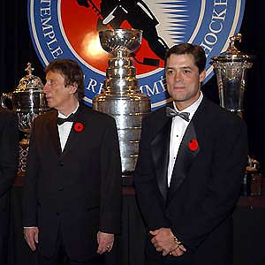 and a beaming Pat LaFontaine acknowledge the applause from the hundreds of Induction attendees. (November 3, 2003)