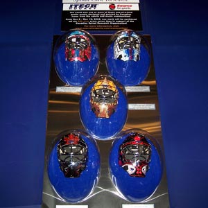 The five fundraising masks on display at the Hockey Hall of Fame. The masks are designed by, starting from the top left and working down to the bottom right, the family of Mike Weir, The Barenaked Ladies, The Tragically Hip, Nickelback and Don Cherry.