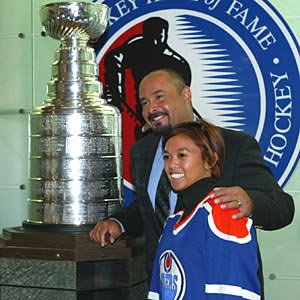2003 Inductee Grant Fuhr poses with the Stanley Cup and an Oiler fan. (November 6, 2004 - Dave Sandford)