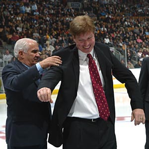 Jim Gregory, the Hockey Hall of Fame Selection Committee President, helps Larry Murphy with his blazer. (November 6, 2004 - Dave Sandford)
