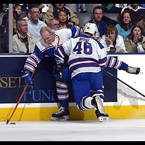 Lanny McDonald of the Original 6 Legends team is pinned on the boards by Craig Muni of the Expansion Legends team. (November 6, 2004 - Dave Sandford)