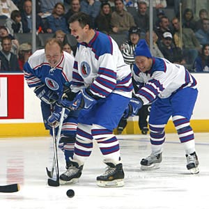 Nick Kypreos (back right) hooks Wendel Clark (left) while the latter attempts to back check Peter Stastny. (November 6, 2004 - Dave Sandford)