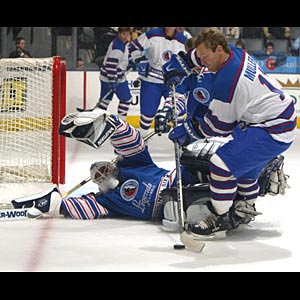 Netminder Bill Randford sprawls across the crease as Kirk Muller tries to corral the puck. (November 6, 2004 - Dave Sandford)