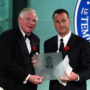 HHOF Chairman Bill Hay (left) presents Paul Coffey his Hall of Fame plaque. (November 8, 2004 - Dave Sandford)