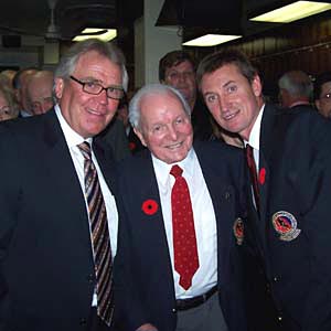 As the night wound down, friends got together to share numerous stories and photo sessions. Pictured are (from left to right) Honoured Members Glen Sather, Clint Smith and Wayne Gretzky. (November 8, 2004 - Scott Veber)