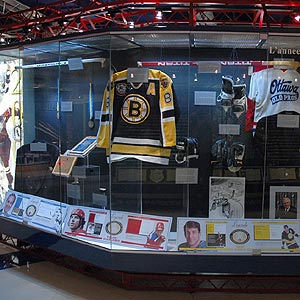The Hockey Hall of Fame proudly exhibits artifacts from the careers of the newest Honoured Members. This showcase, located just past the Admissions desk, is one of the highlights of any visit to hockey's shrine. (4-Nov-05 Craig Campbell)
