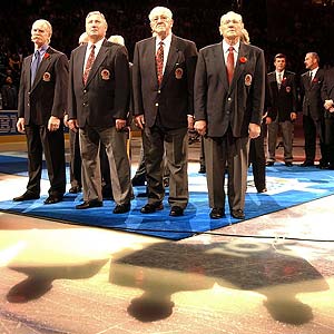 Prior to the Toronto/Tampa Bay game Saturday night, some of the greatest players of all time welcomed the newest Honoured Members. Cam Neely, Murray Costello and the family of the late Valeri Kharlamov were greeted by (left to right) Lanny McDonald, Fernie Flaman, Marcel Pronovost and Johnny Bower, among others. (Dave Abel/HHOF)