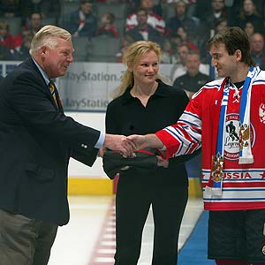 Bill Hay of the Hockey Hall of Fame welcomes to centre ice Sunday the daughter and son of the late Valeri Kharlamov. Each of the newest Inductees received their official Hockey Hall of Fame Induction blazer, designed by Hugo Boss, prior to the Legends Classic Game in which Alexander Kharlamov participated. (Dave Sandford/HHOF)