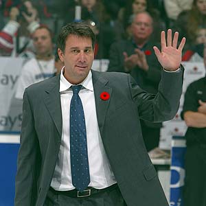 upon his introduction. After donning his Hall of Fame blazer before the opening faceoff, Neely ducked into the Canadian dressing room and suited up, playing the second and third periods of the Legends Classic contest. (DaveSandford/HHOF)