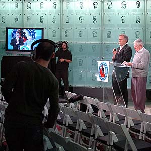 The MCI Great Hall was converted into an ornate television studio by TSN for the broadcast portion of the 2005 Induction Celebration. Hosts John Wells (left) and Dick Irvin prepare and rehearse in front of the Honoured Members Wall at the Hockey Hall of Fame. (Scott Veber/HHOF)