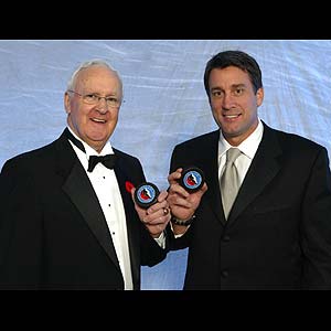 The Class of 2005 -- Murray Costello (left), inducted in the Builder Category, and Cam Neely, inducted in the Player Category. Soviet star Valeri Kharlamov was posthumously inducted, also as a player, to round out the trio of hockey elite who are the 2005 Honoured Members of the Hockey Hall of Fame. (Dave Sandford/HHOF)