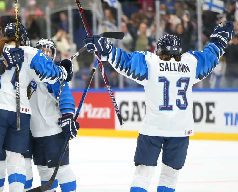 Sallinen celebrates with teammates after a goal against Canada during the semi finals at the 2019 IIHF Ice Hockey Women's World Championship. (Andre Ringuette/HHOF‐IIHF Images)