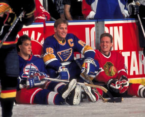 Teemu Selanne, Brett Hull and Jeremy Roenick during the 1994 NHL All-Stars Skills Competition at Madison Square Garden on January 21, 1994. (Paul Bereswill/HHOF)