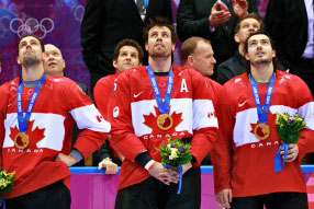 Canada's Dan Hamhuis, Shea Webber and Drew Doughty look on after a 3-0 men's gold medal win over Sweden at the Sochi 2014 Olympic Winter Games. (Jeff Vinnick/HHOF-IIHF)