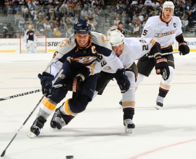 Shea Weber fights off an Anaheim Ducks defender during an NHL game on October 9, 2010, at Bridgestone Arena in Nashville, Tennessee.(HHOF)
