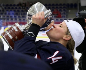 Brianna Decker celebrates with the Championship trophy after a thrilling 7-5 victory over Canada in the gold medal game at the 2015 IIHF Women’s World Championship. (Andre Ringuette /HHOF-IIHF)