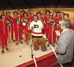 During his seven seasons in Philadelphia, Fred and the Flyers enjoyed four consecutive Campbell Bowl wins with Philadelphia as regular season winners of the West Division (1973-74) and Campbell Conference (1974-75 to 1976-77). During that period, Shero coached the Flyers in 554 regular season games, winning 308, losing 151 and tying 95 more for a winning percentage of .642. In 83 playoff games, Fred led the Flyers to 48 wins and 35 losses for a .578 winning percentage. He is one of only six NHL coaches to lead his club to consecutive 50+ win seasons, a feat accomplished from 1973-74 to 1975-76. During his high-profile days with the Flyers, Fred was rewarded by being named the NHL All-Star coach of the Campbell Conference team in 1975, 1976, 1977 and 1978.