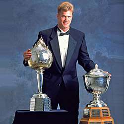 | Pronger was awarded the Norris Trophy as the league's top defenceman and the Hart Trophy as league MVP in 2000. |