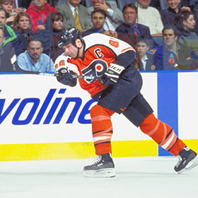 Dressed in Flyers' orange, black and white, Lindros immediately become one of the most dominating players in the NHL. In 1992-93, his first NHL season, he scored 41 goals and collected 75 points, to go along with 147 minutes in penalties, and was named to the NHL's All-Rookie Team. He increased his productivity in year two, contributing 44 goals, 97 points and 103 penalty minutes.