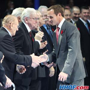 2009 Inductee Steve Yzerman shakes hands with Honoured Members after being introduced to the crowd at the Air Canada Centre prior to the 2009 Hockey Hall of Fame Game. (Rachel Tokarski/HHOF/Nov.7 2009)