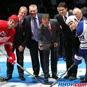 The 2009 Hockey Hall of Fame Inductees drop the ceremonial faceoff at the annual Hockey Hall of Fame Game in Toronto.