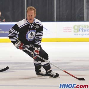 2009 Inductee Brian Leetch looks to move the puck up ice during The Source For Sports Hockey Hall of Fame Legends Classic.