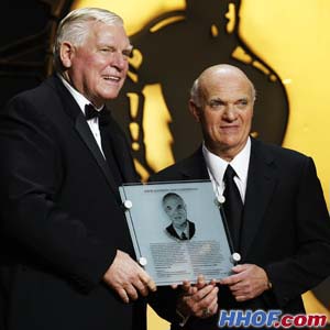 Chairman and Chief Executive Officer of the Hockey Hall of Fame Bill Hay presents 2009 Inductee Lou Lamoriello with his Honoured Member plaque. (Dave Sandford/HHOF/Nov.9 2009)