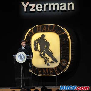2009 Player Inductee, Steve Yzerman makes his acceptance speech at the 2009 Induction Ceremony. (Matthew Manor/HHOF/Nov.9 2009)