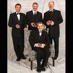 The newest Honoured Members of the Hockey Hall of Fame, Bernie Federko (left), Clark Gillies (centre), Rod Langway (right), and Roger Neilson (seated) at their formal Induction portrait session.