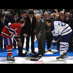 The Hockey Hall of Fame's newest Inductees dropped the puck for the ceremonial faceoff prior to the Hockey Hall of Fame Game. Captain Saku Koivu and alternate-captain Bryan McCabe faced each other for the puck-drop. (11-Nov-2006-Brad White/HHOF)