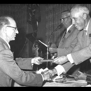 High-scoring Montreal Canadiens star Aurele Joliat (left) is honoured at the 1959 Induction ceremony (Toronto - Turofsky Collection)