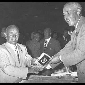 Conn Smythe (left), the man who purchased the Toronto hockey club in 1927 and renamed them the Maple Leafs, accepts his induction plaque from Clarence Campbell during the 1959 Induction (Toronto - Turofsky Collection)