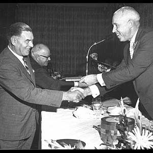 NHL President Clarence Campbell (right) presents Bruins' netminding great Cecil "Tiny" Thompson his induction plaque in 1959 (Toronto - Turofsky Collection)