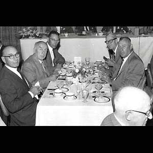 (Left to right) Hall of Famers Frank Nighbour, Cyclone Taylor, Dit Clapper, Bill Cook, and Frank Fredrickson at the 1968 HHOF Induction Dinner (Toronto - Turofsky Collection)