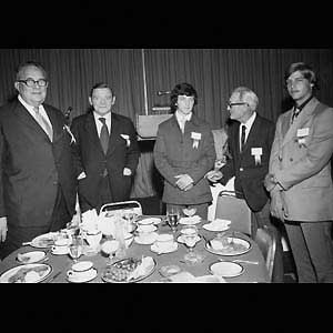A. M. Wirtz, G. Roberts, Busher Jackson's son, R. Weiland and Terry Sawchuk's son at the 1971 HHOF Induction Dinner (HHOF/CNE)