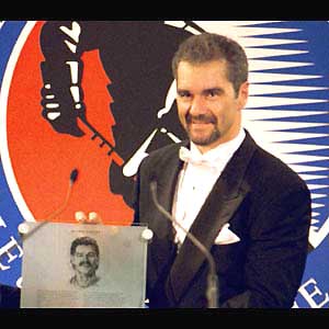 1998 Inductee Michel Goulet shows off his Hall of Fame plaque