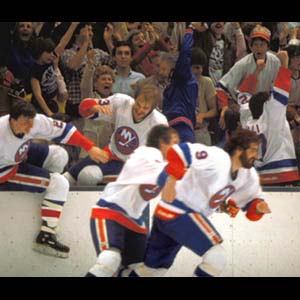 Clark Gillies (foreground) and the Islanders leap over the boards to join the on-ice celebration during New York's four-year reign as Stanley Cup champions in the early eighties.