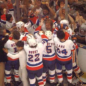 Bob Nystrom is mobbed by his Islander teammates after scoring the Stanley Cup-winning goal against Philadelphia at 7:11 of overtime on May 24, 1980. It was the first of four championships for the New York Islanders.