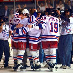 The New York Rangers support one another after ending the franchise's 53-year Cup draught. (June 14, 1994)