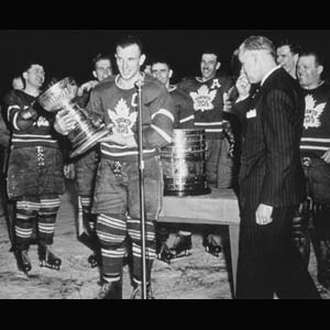 Toronto's Ted Kennedy, in his first year as Leaf captain, accepts the Stanley Cup from league president Clarence Campbell on April 16, 1949. It was the first year the Stanley Cup took on the look with which we